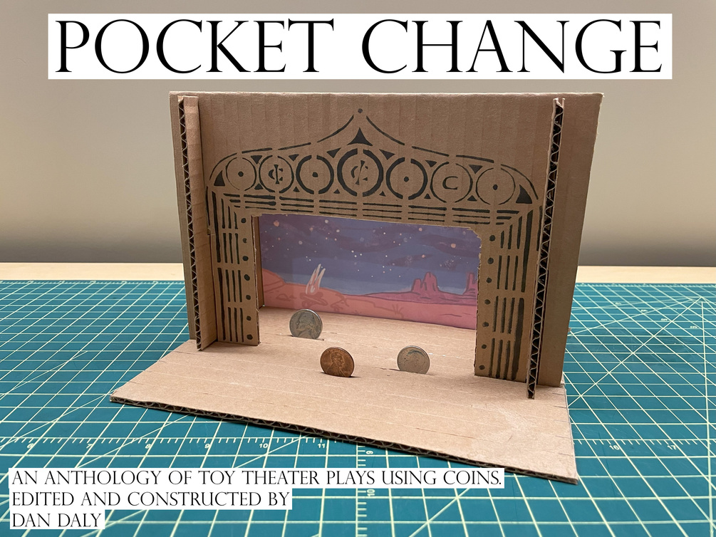 POCKET CHANGE is an anthology of eleven short plays your coins perform for you. Housed within a small cardboard theater, named Lin-coin Cent-er, the plays use literal coins as the actors. The complete project consists of this theater, a small booklet containing the plays and associated notes, and a series of backdrops created for each of the plays. Basically, POCKET CHANGE is an intimate piece of toy theater that can be performed by anyone, anywhere.